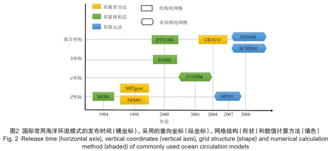 目前国际上常用的全球海洋环流模式主要有 MOM、NEMO、HYCOM 等。其中,NEMO 是由法国、英国和意大利共同研发的,MOM 是由美国地球物理流体动力学实验室(GFDL)研发的,HYCOM 是由美国海军舰队数值气象海洋中心(FNMOC)、美国海军研究实验室(NRL)、美国国家大气预测中心(NCEP)等多家机构合作研发的。如图 2 所示,各模式采用的垂直坐标、网格结构和数值计算方法不同。在不同垂向坐标系中,Z 坐标系对于浅水区混合层的描述具有一定的优势;σ 坐标可以刻画海底地形,但是对于浅水区的混合层描述不理想;与 σ 坐标相比,S 坐标系在温跃层和底边界层具有很好的解析度。在水平方向,与结构网格点相比,非结构网格在近岸和远海可采用不同的分辨率,近岸采用细网格,远离岸基或远海区域采用分辨率比较粗的网格,在提高海岸线和河口等复杂地形解析度的同时,还可以提高计算效率。