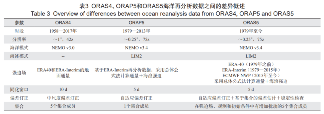 ECMWF 的海洋再分析数据目前已经有 ORAS4、ORAP5、ORAS5 和 ORA-20C 这 4 种,其中 ORAS5 是基于海洋业务系统 OCEAN5 生成的,该系统耦合了海冰模式和 NEMO 3.4 版。ORAS4、ORAP5 和 ORAS5 这 3 种数据产品的分辨率、模式、强迫数据和观测数据都历经逐步更新改进(表 3)。