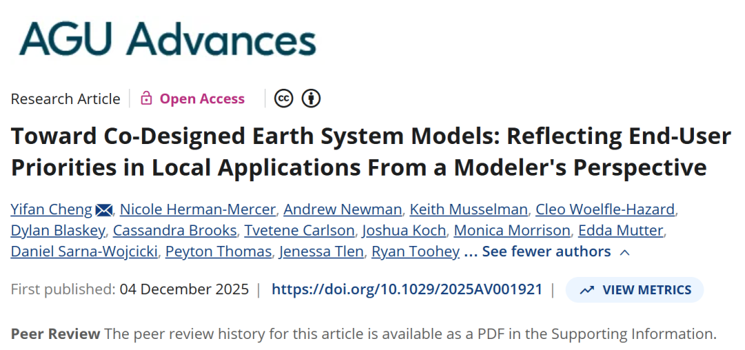 Cheng, Y., Herman-Mercer, N., Newman, A., Musselman, K., Woelfle-Hazard, C., Blaskey, D., et al. (2025). Toward co-designed Earth system models: Reflecting end-user priorities in local applications from a modeler's perspective. AGU Advances, 6, e2025AV001921. https://doi.org/10.1029/2025AV001921