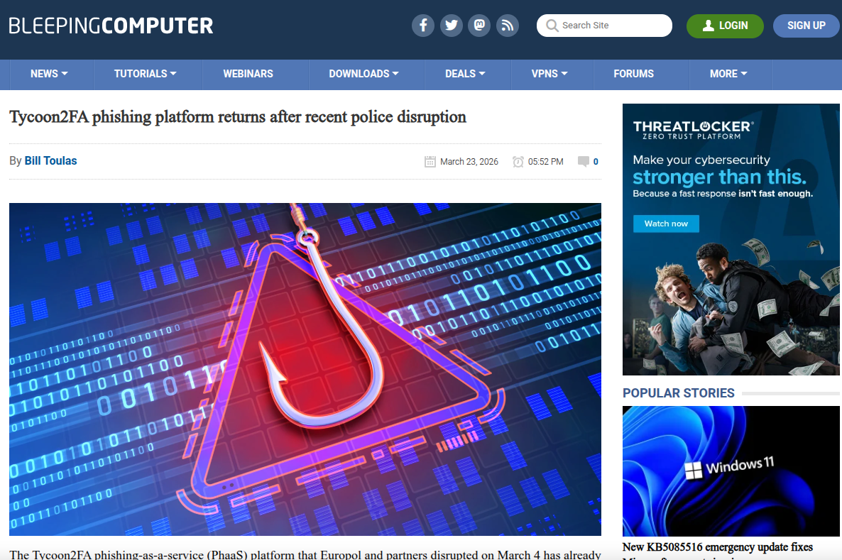 在网络空间安全的博弈中,网络钓鱼攻击长期占据着初始访问向量(Initial Access Vector)的主导地位。随着多因素认证(MFA)技术的广泛普及,传统的凭证窃取手段逐渐失效,迫使攻击者寻求更高级的技术突破。在此背景下,以Tycoon2FA为代表的“钓鱼即服务”(PhaaS)平台应运而生,它们将复杂的MFA绕过技术封装为标准化产品,极大地降低了网络犯罪的门槛。然而,2024年发生的Tycoon2FA平台被执法部门取缔后迅速复活的事件,标志着网络犯罪生态系统已具备极强的自我修复与进化能力。
