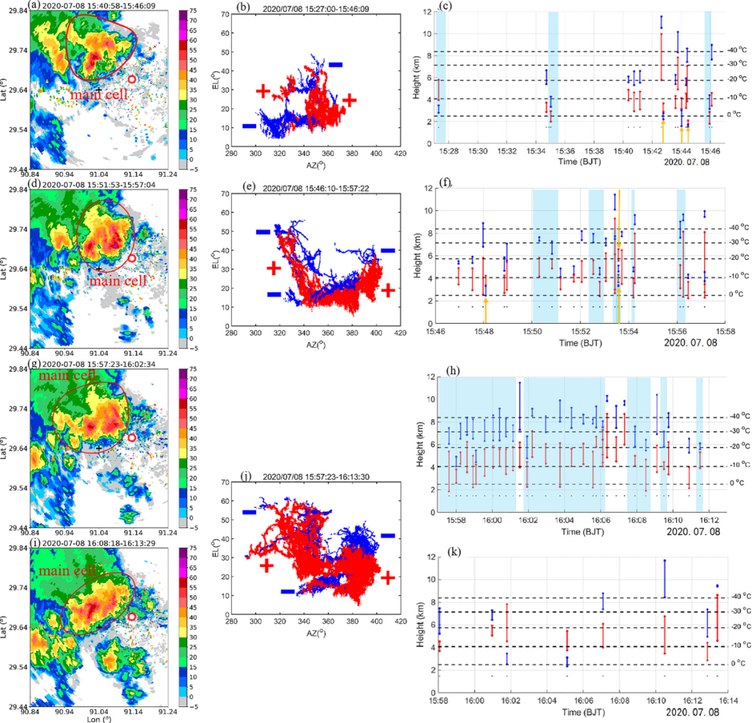 图1. 雷暴单体雷达反射率(左)、基于闪电甚高频动态成像干涉仪的辐射源分布(中)与确定的云内电荷极性和高度(右)。闪电辐射源分布和电荷结构图中红色(蓝色)表示正电荷区(负电荷区),黑色虚线表示环境温度。