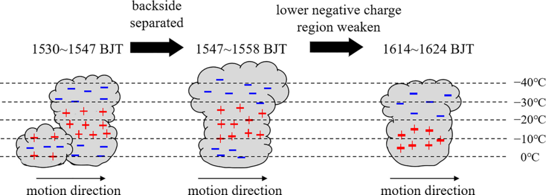 图2. 反演的雷暴云内电荷结构演变示意图。蓝色“-”和红色“+”分别代表负、正电荷区,黑色虚线代表环境温度。