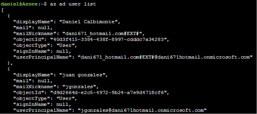 运行如下命令列出Microsoft Azure活动目录的用户列表。