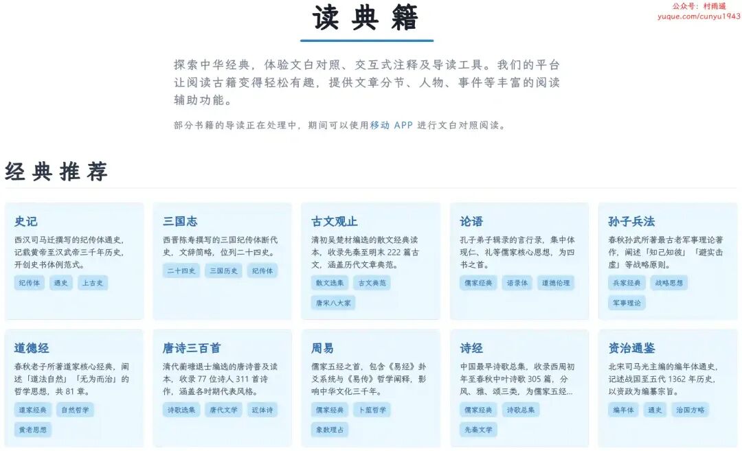 提供丰富的中华经典阅读体验,包括文白对照、交互式注释及导读工具。平台让阅读古籍变得轻松有趣,提供文章分节、人物、事件等丰富的阅读辅助功能。