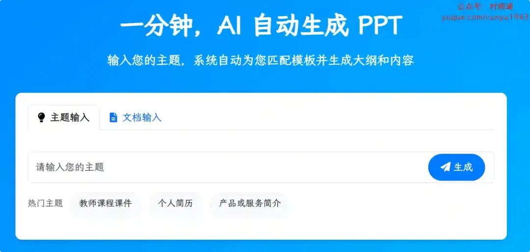 一个 AI 在线智能生成 PPT 的平台,主要功能包括:AI 智能写 PPT,PPT 在线编辑、修改和导出,提供根据主题,文档,文本等多种方式生成 ppt。
