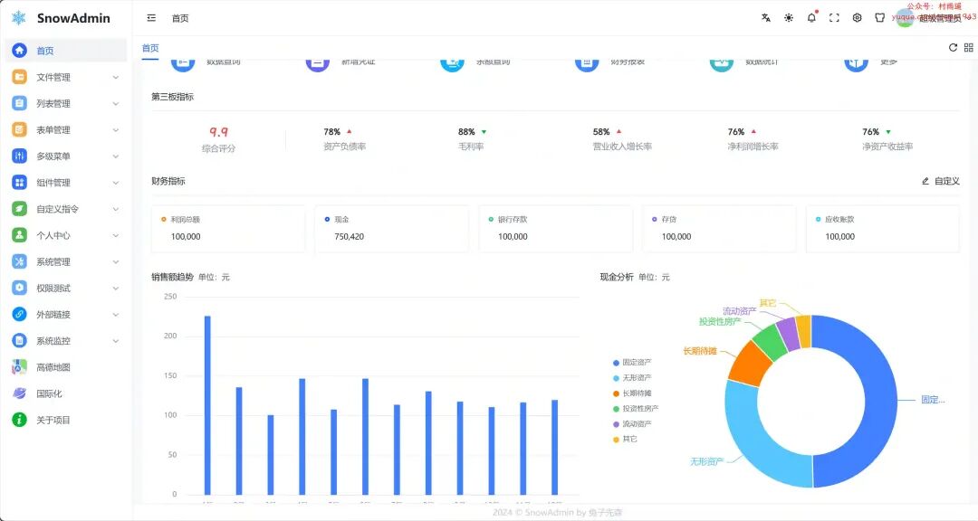 一个清新优雅、高颜值且功能强大的后台管理模板,基于最新的前端技术栈,包括 Vue3, Vite5, TypeScript, Pinia。它内置了丰富的主题配置和组件,代码规范严谨,实现了自动化的文件路由系统。SnowAdmin 提供了一站式的后台管理解决方案,无需额外配置,开箱即用。