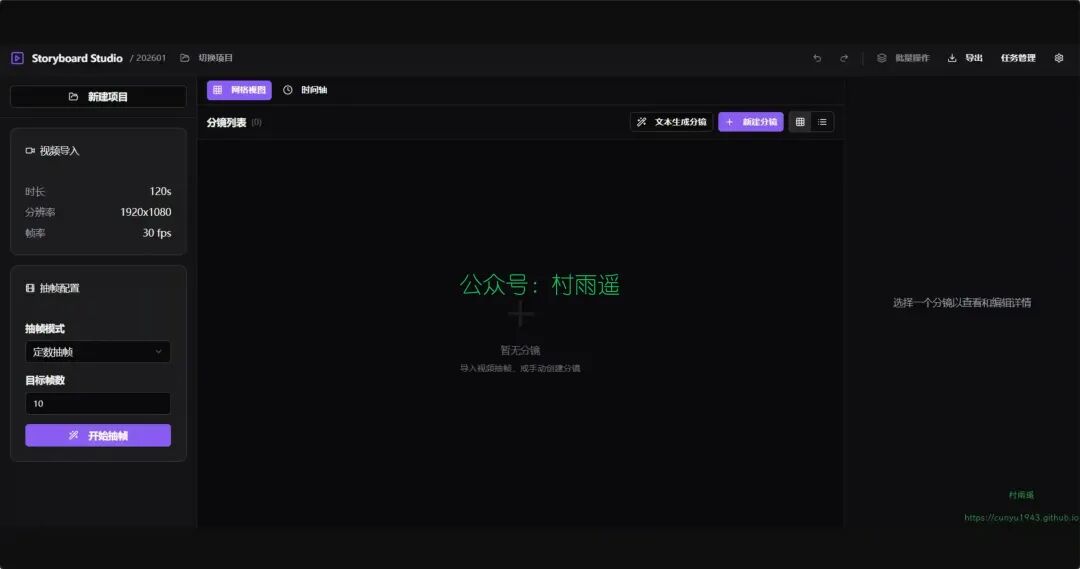 面向创作者与制作团队的本地分镜工作台:从视频导入、抽帧、AI 分析、图像 / 视频生成,到批量任务与成片合成,一条链路完成分镜资产管理与输出。