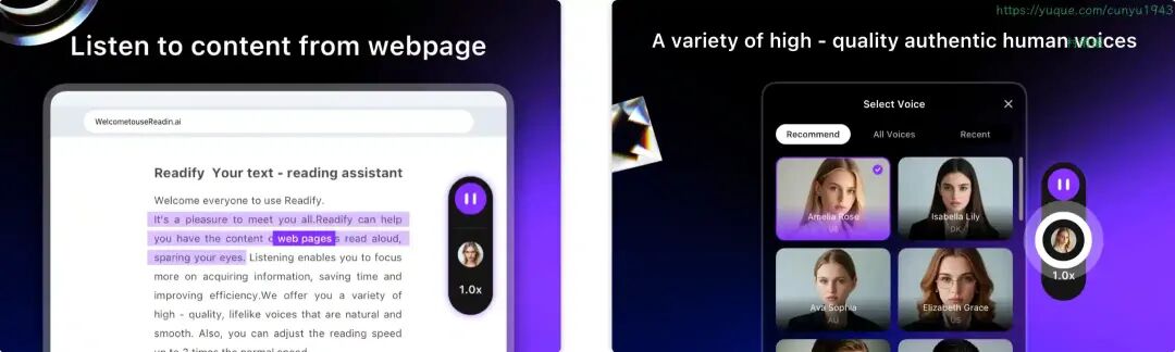 AI 仿真朗读阅读器,利用 AI 文本转语音 (TTS) 技术将网页内容转换为音频(支持 30 多种语言),并提供语速控制、文本高亮和悬浮控件等功能。