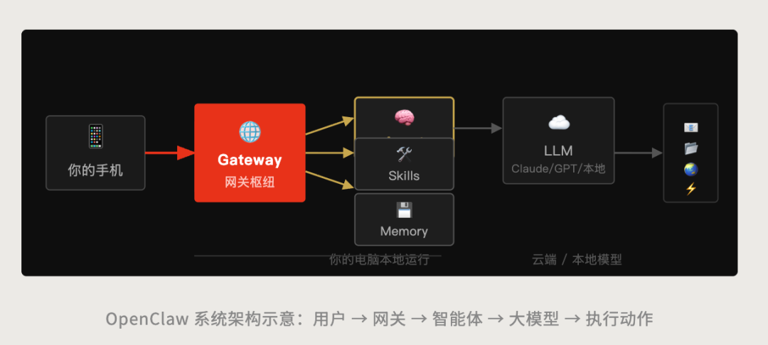 它的核心架构由四个部分构成:Gateway(网关)负责连接各类聊天平台;Agent(智能体)负责理解上下文、制定行动计划;Skills(技能)让它能访问网页、读写文件、操作邮箱;Memory(记忆)将对话和偏好以本地文件形式保存,越用越懂你。