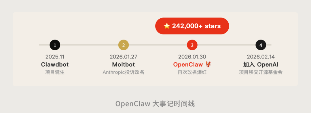 2026 年 1 月,项目爆红。随后 Anthropic 以商标侵权为由投诉,项目不得不在 24 小时内改名两次,先变成 Moltbot(还是龙虾主题),再变成如今的 OpenClaw。
