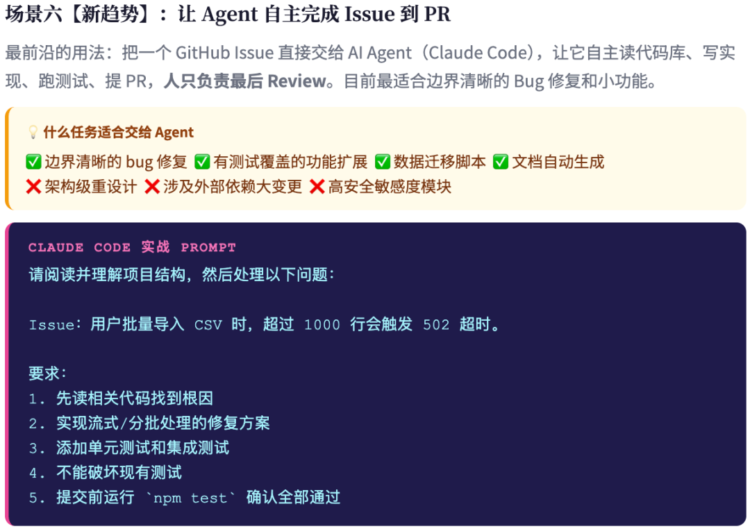 工具选好了,更关键的是在对的场景用对的深度。2026 年有个新趋势值得注意:开发者已不满足于"AI 给建议",而是要求 AI 直接执行并交付结果。以下五个场景是目前实测效果最稳定的高价值用法。