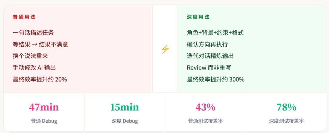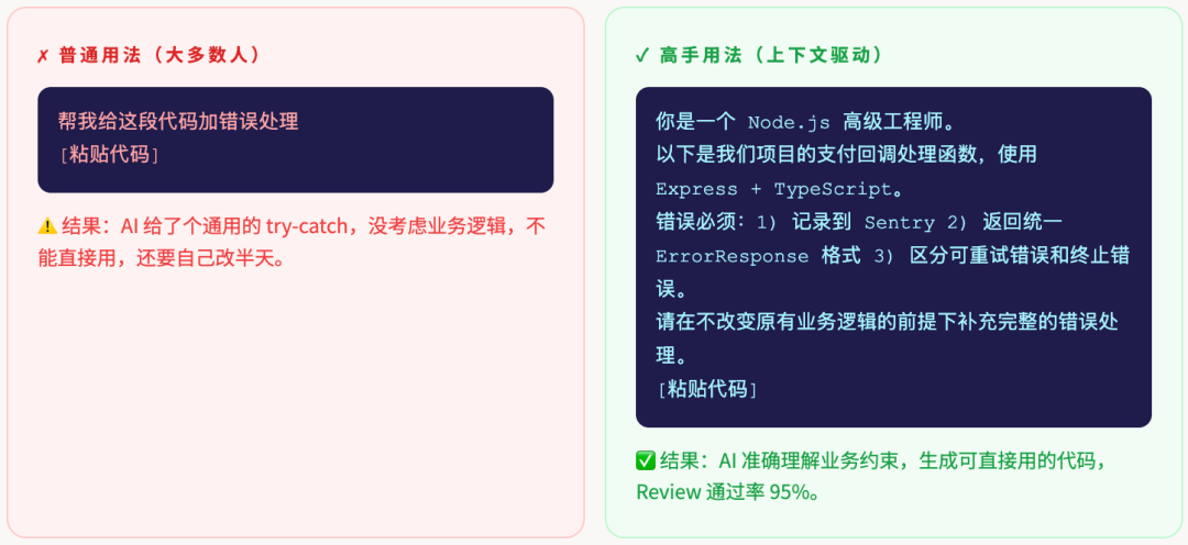 核心差异:给 AI「角色 + 项目背景 + 技术约束 + 具体要求」,而不只是任务本身。上下文越丰富,输出质量越高——这是提示词工程的第一原则。