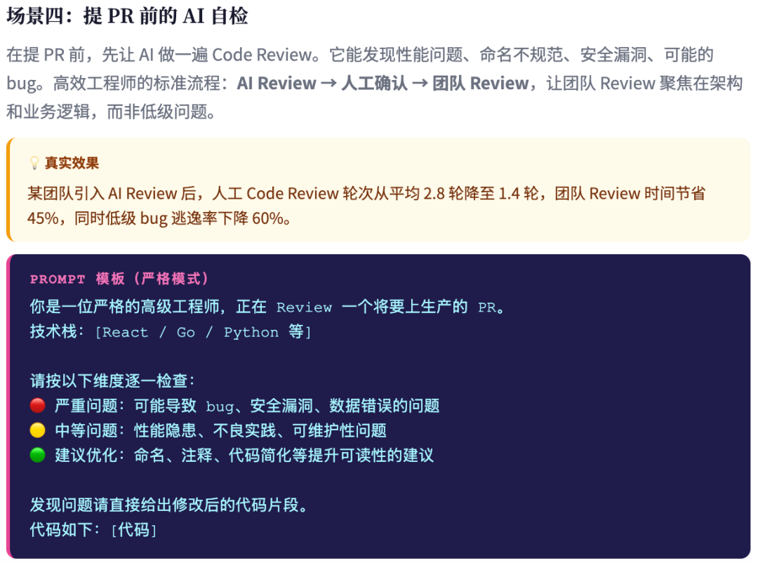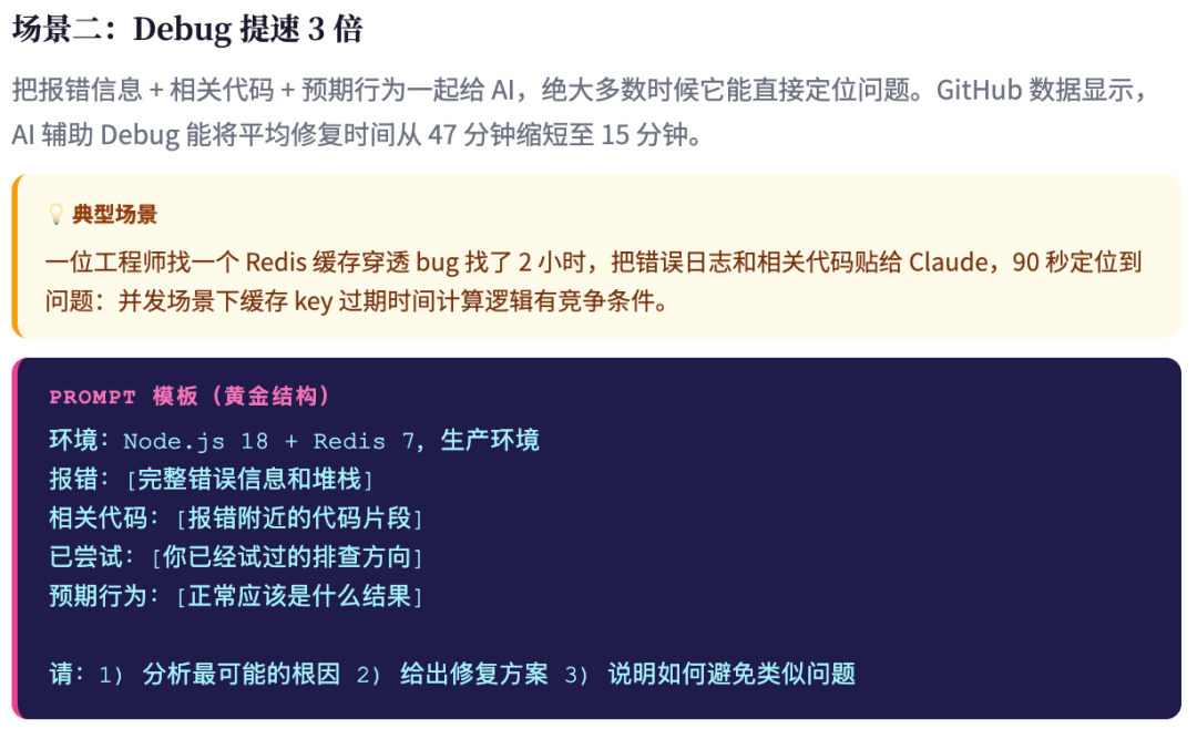 只给了一句"帮我写个用户登录页面",AI 生成的代码没考虑 XSS 防护和 token 过期处理。他没做 Review 直接合并上线,导致线上故障。教训:AI 生成 ≠ 可直接上线。