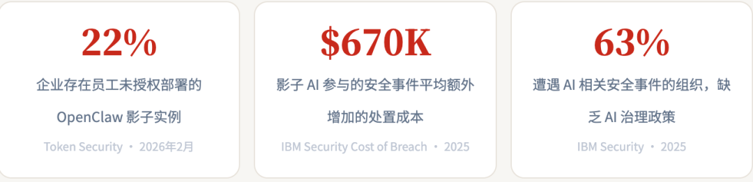 IBM Security 数据:影子 AI 参与的安全事件平均额外增加 $670,000 处置成本——主要原因是安全团队在事发时完全不知道代理存在。Sophos 明确指出:对新技术说"不",但不提供替代方案,往往催生更多不合规行为。