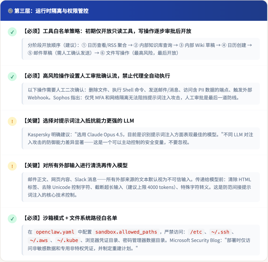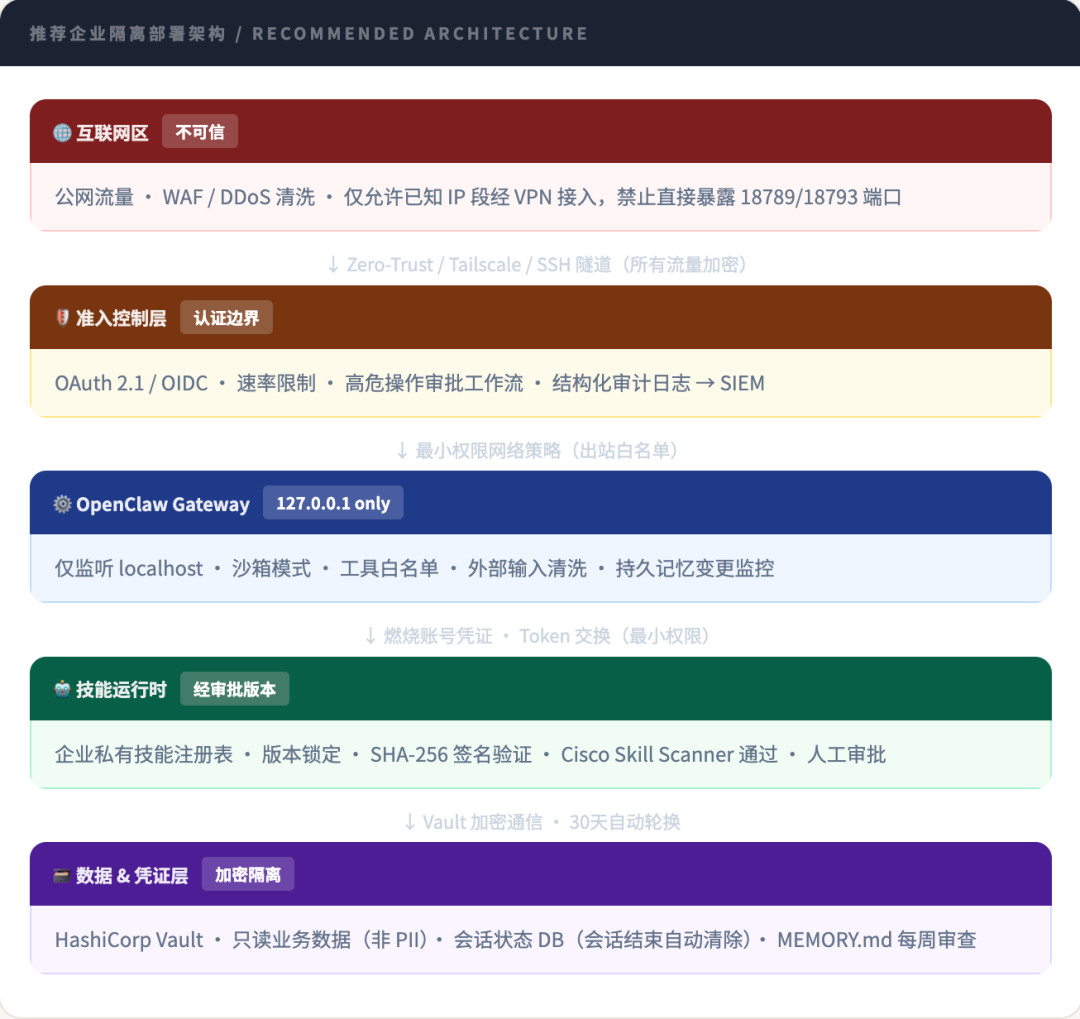 在专用隔离环境中部署经审查的只读型技能,完成稳定性验证。Microsoft Security Blog 建议:"初始部署仅访问非敏感数据和专用非特权凭证",在建立行为基线之前不扩展写权限。Oasis Security 进一步建议:"持续监控和重建计划应成为运营模型的一部分。"