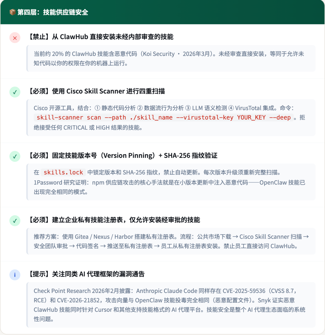 ✅ 通过标准:治理委员会已成立并运营;有可追溯的技能生命周期记录;红队演练每季度执行