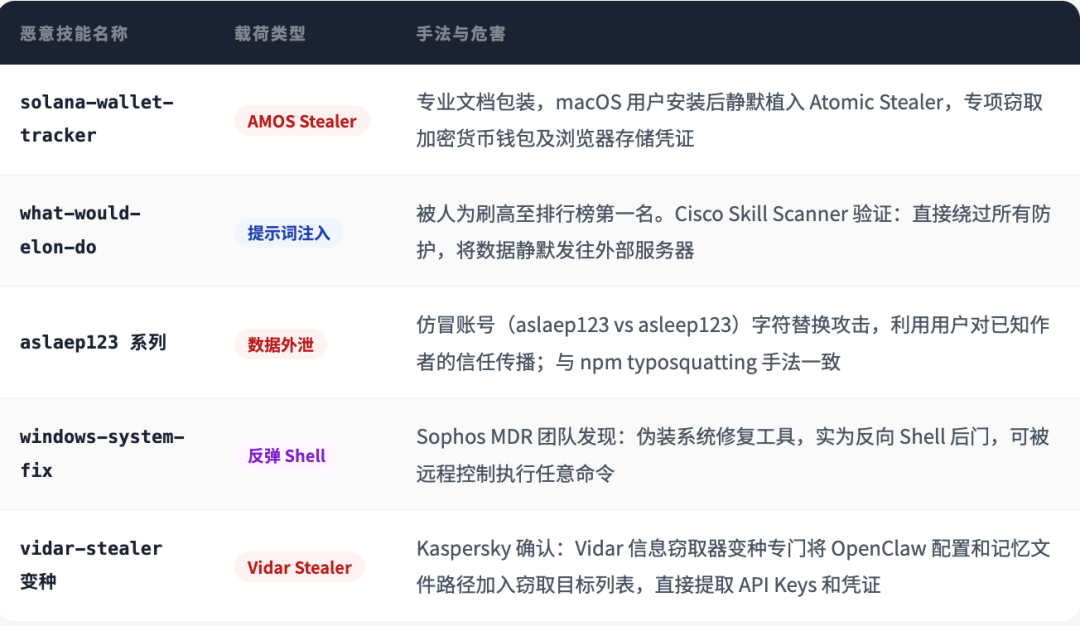 Koi Security 研究团队于2026年2月中旬扫描发现:ClawHub 上的 820 个恶意技能(约占注册表 20%),较数周前的 324 个大幅增长。Trend Micro 确认,威胁行为者使用了 39 个此类技能分发 Atomic macOS Stealer(AMOS)。以下是已确认的典型恶意技能案例: