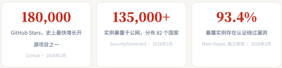 数据来源:Oasis Security(CVE-2026-25253 ClawJacked)· Kaspersky Blog(OpenClaw Vulnerabilities)· Sophos(Enterprise Warning Shot)· Cisco(Skill Scanner, AI Security State 2026)· Microsoft Security Blog · Endor Labs(6-CVE Disclosure)· Koi Security(ClawHub Analysis)· SecurityScorecard STRIKE Team · Bitsight TRACE · IBM Security Cost of Breach 2025 · Dark Reading · CSO Online · Admin By Request · Conscia · 1Password · Trend Micro · Check Point Research · Snyk · Eye Security · Token Security · Reco AI · 工信部技术安全研究院