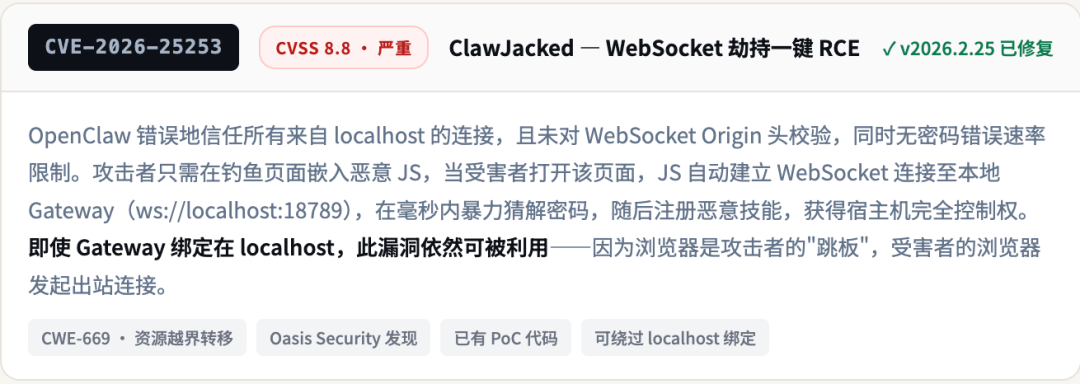 ☠️ ClawJacked 完整攻击链(CVE-2026-25253):