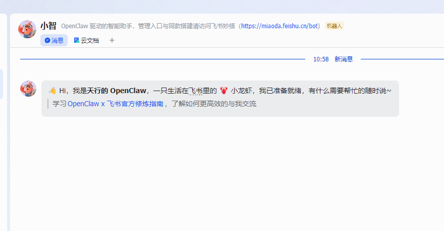审批通过后,OpenClaw 会提示部署完成,此时可以在飞书中直接对话使用!