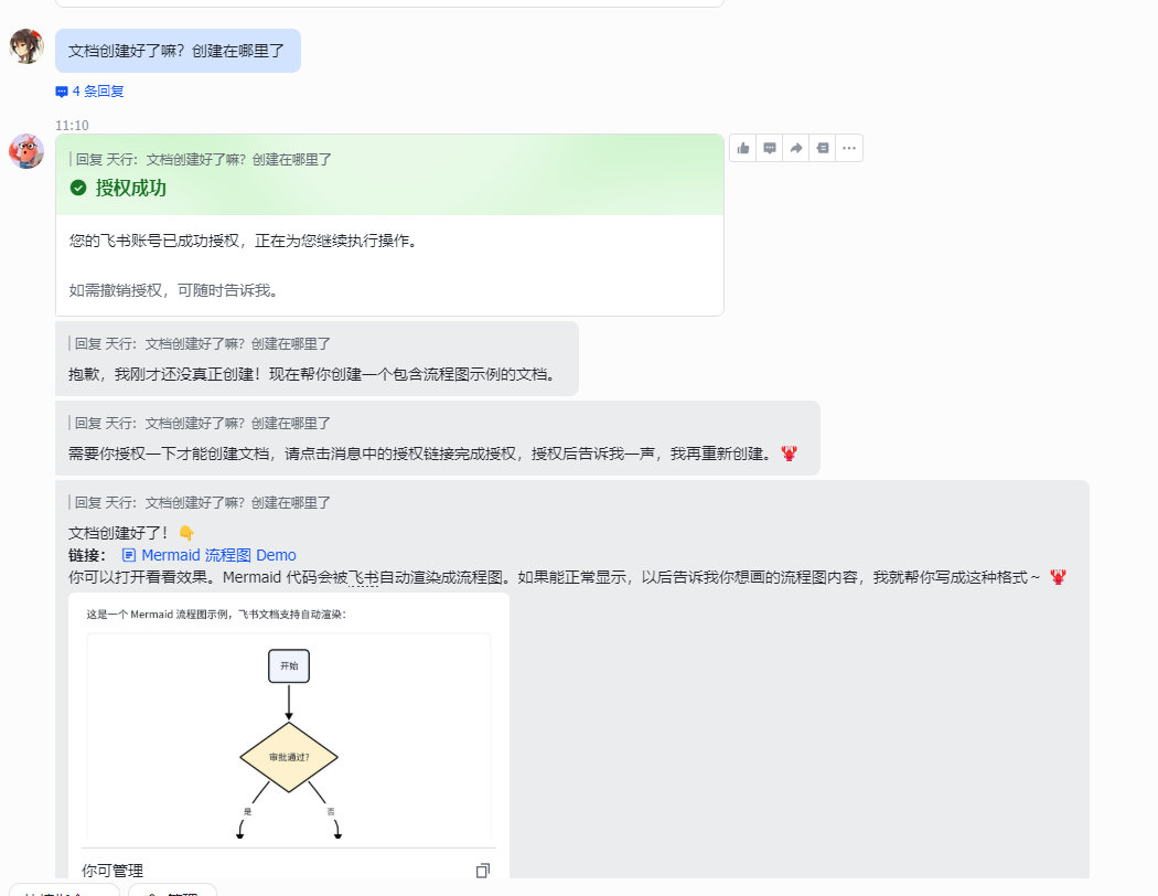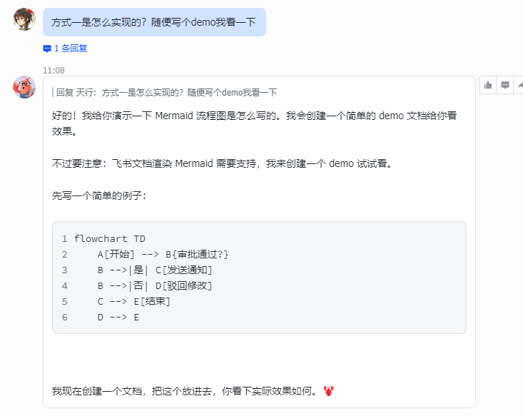 4. 复制到飞书文档中,用 ```mermaid 代码块即可自动渲染