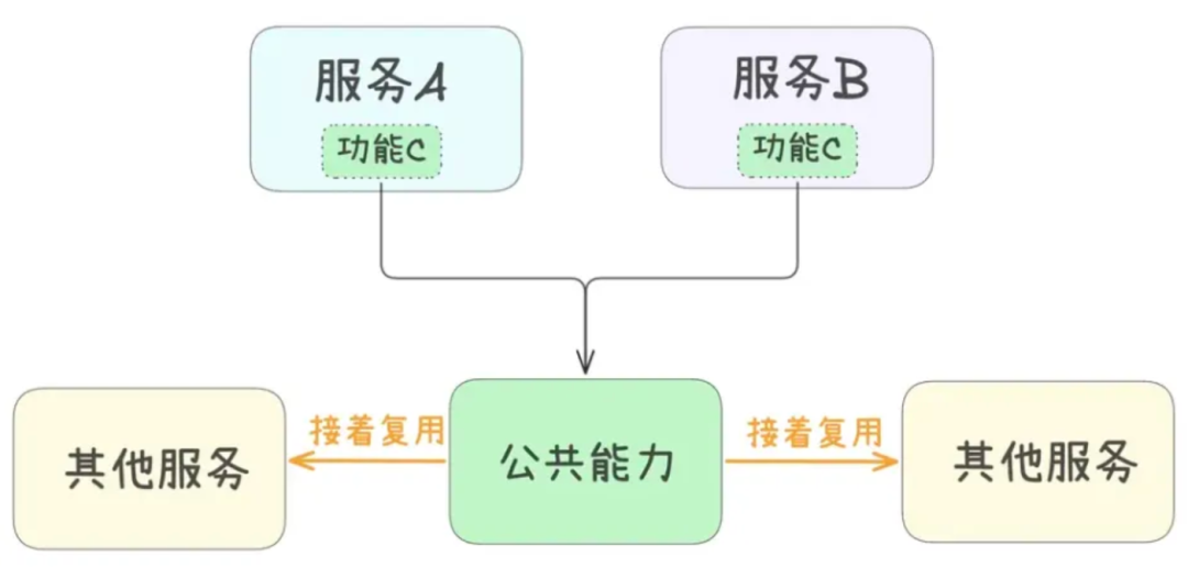 中台一词,常常出现在各种软件架构的设计中,其核心理念用两个字就可以概括:复用,即把相同功能抽离出来,减少重复建设,如下图: