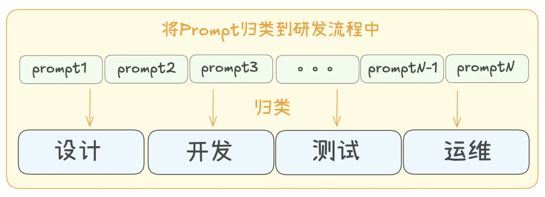 好,我们接着说,如果软件开发的过程就是Prompt的总和!那我们想想,其实软件开发的流程是非常固定的,从设计->开发->测试->运维,那我们就可以把SKIlls按流程进行分类!让它们归到这个框架内。这样我们就拥有了一个识别方法,即面对这成千上万个Skills,我们就可以分区,哦,它对于我们哪些工作环节是帮助的。通过这种方法,我们就可以把好的经验和方法覆盖到软件工程的整个全周期中,做到极致的提效!