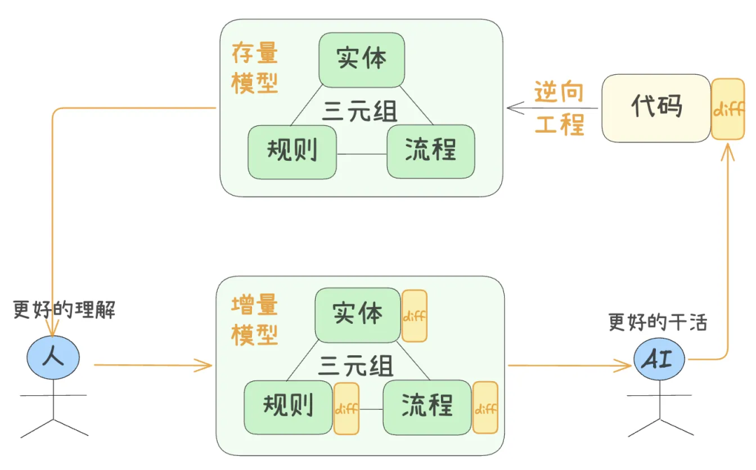 逆向建模,是我在开发过程中,使用的最高频的场景。它对应着我们最常见应用场景:需求迭代。针对一个需求迭代的过程,我们总是可以抽象成三个步骤,在AI时代,我们需要思考:如何利用SKills增强这三个流程!而逆向建模就是一个很好的方法!
