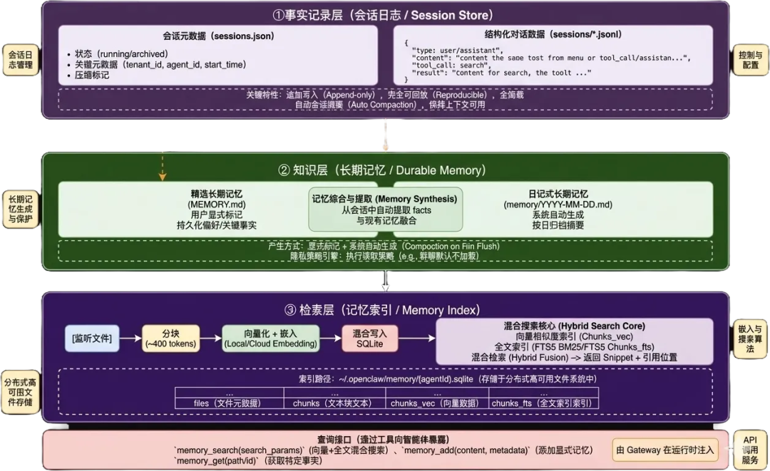 动态记忆 | JSONL 文件 | ~/.openclaw/agents/{agentId}/sessions/*.jsonl | 自动记录 |