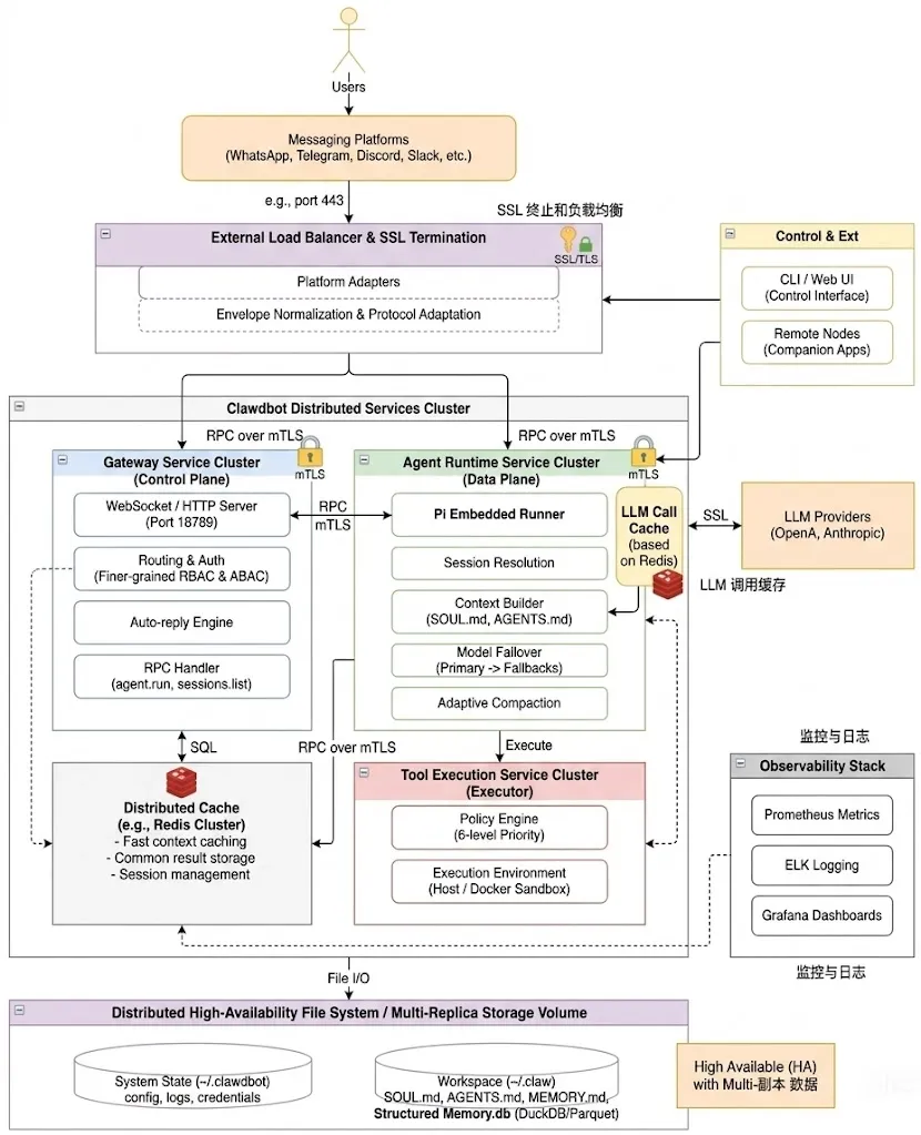 关于 OpenClaw 的整体系统架构,已经有很多文章进行了解读和分析,其核心思想是通过统一的 Gateway 进程管理所有外部通讯平台的链接,通过 Agent Runtime 进行各个大模型的后台调用,所有产生的数据、记忆全部存储在本地磁盘上,其系统架构如下所示: