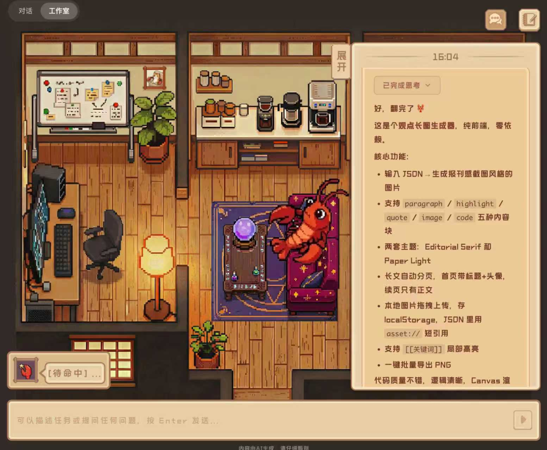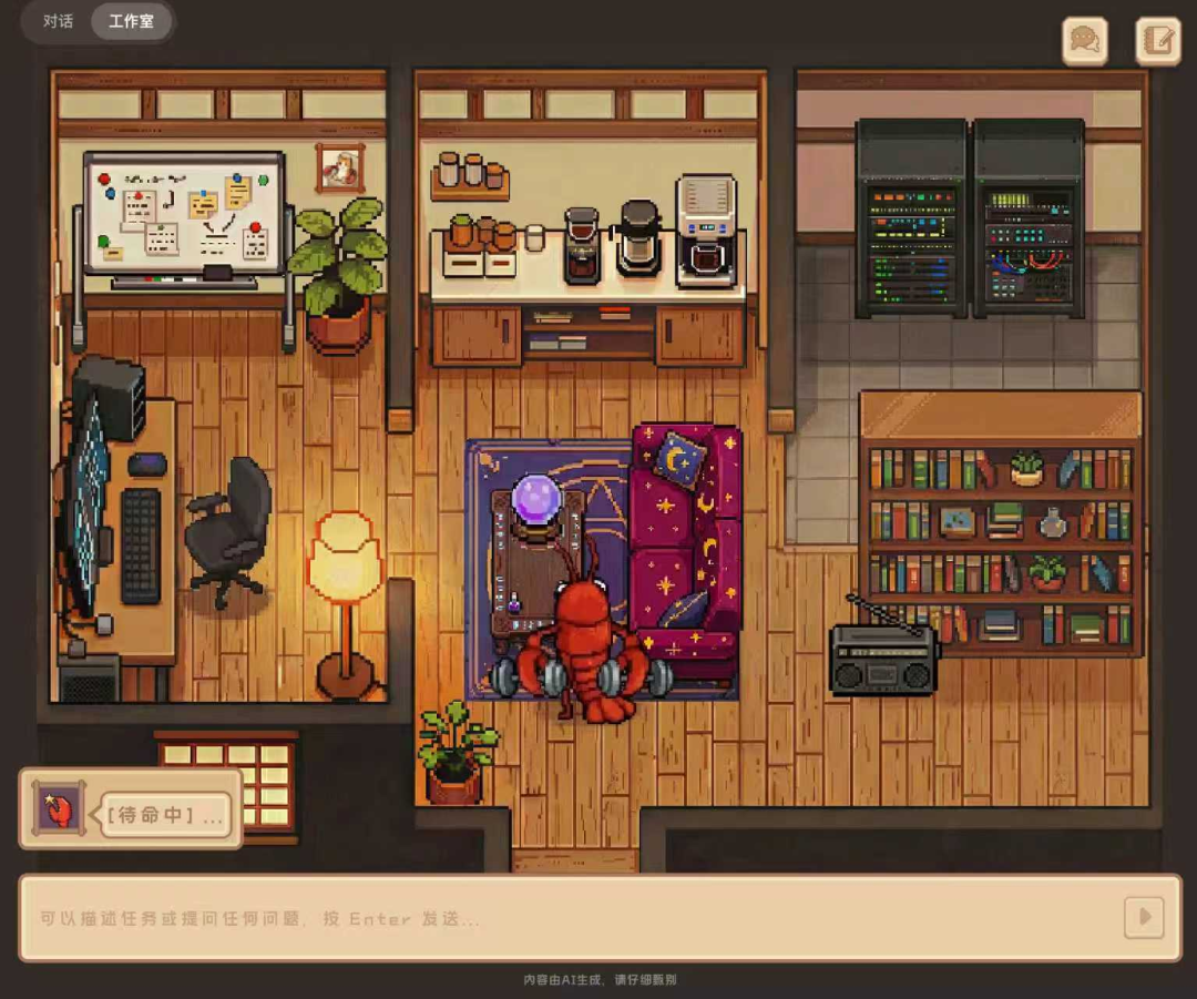 另外想提一个 QClaw 另外有意思的地方,就是这个像素风格的工作室: