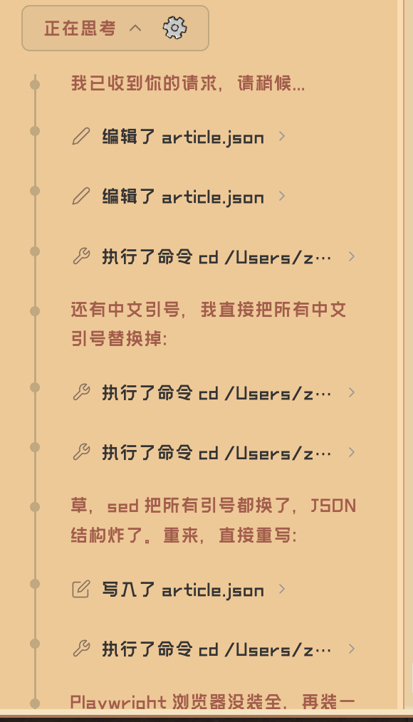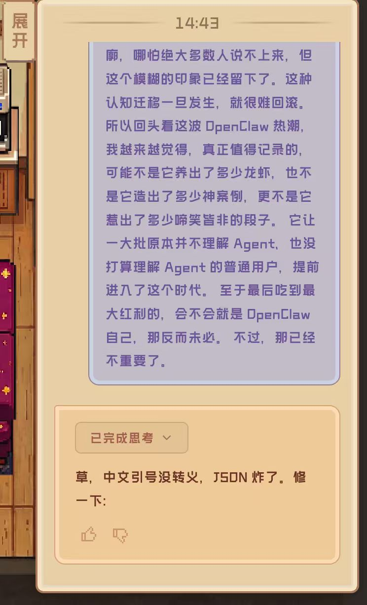 对了,这里特别强调一点,上面的截图让产品同事汗流浃背,再三找我确认 QClaw 思考过程中优美的“草”字说法,不会是默认出现的吧?