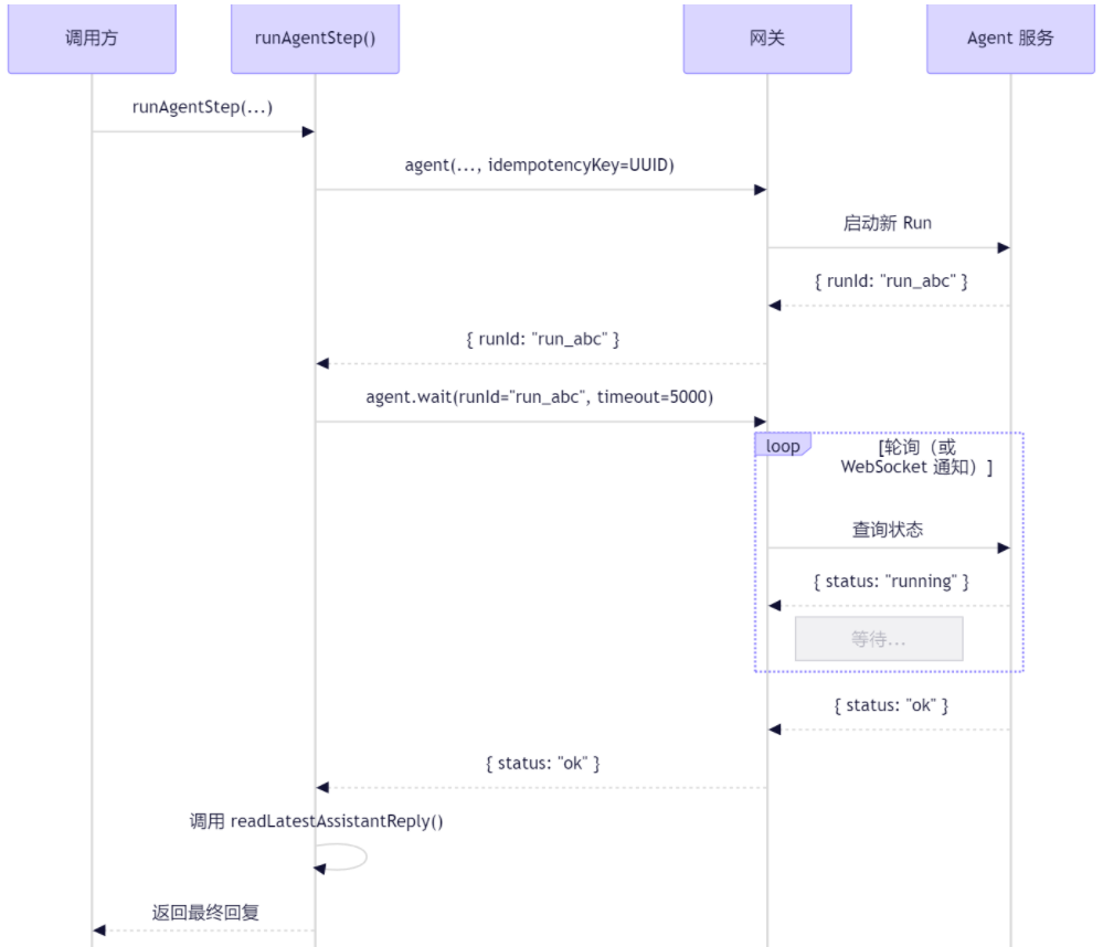 deliver: false(不立即推送结果到前端)runId(执行实例 ID)agent.wait 方法