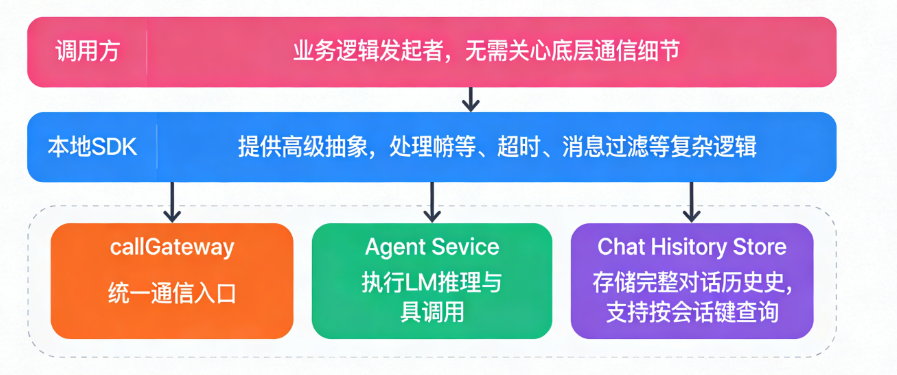 callGateway(橙):统一通信入口Agent Service(绿):执行 LLM 推理与工具调用Chat History Store(紫):存储完整对话历史,支持按会话键查询这种分层设计实现了关注点分离:调用方专注业务,SDK 专注可靠性,网关专注执行与存储。