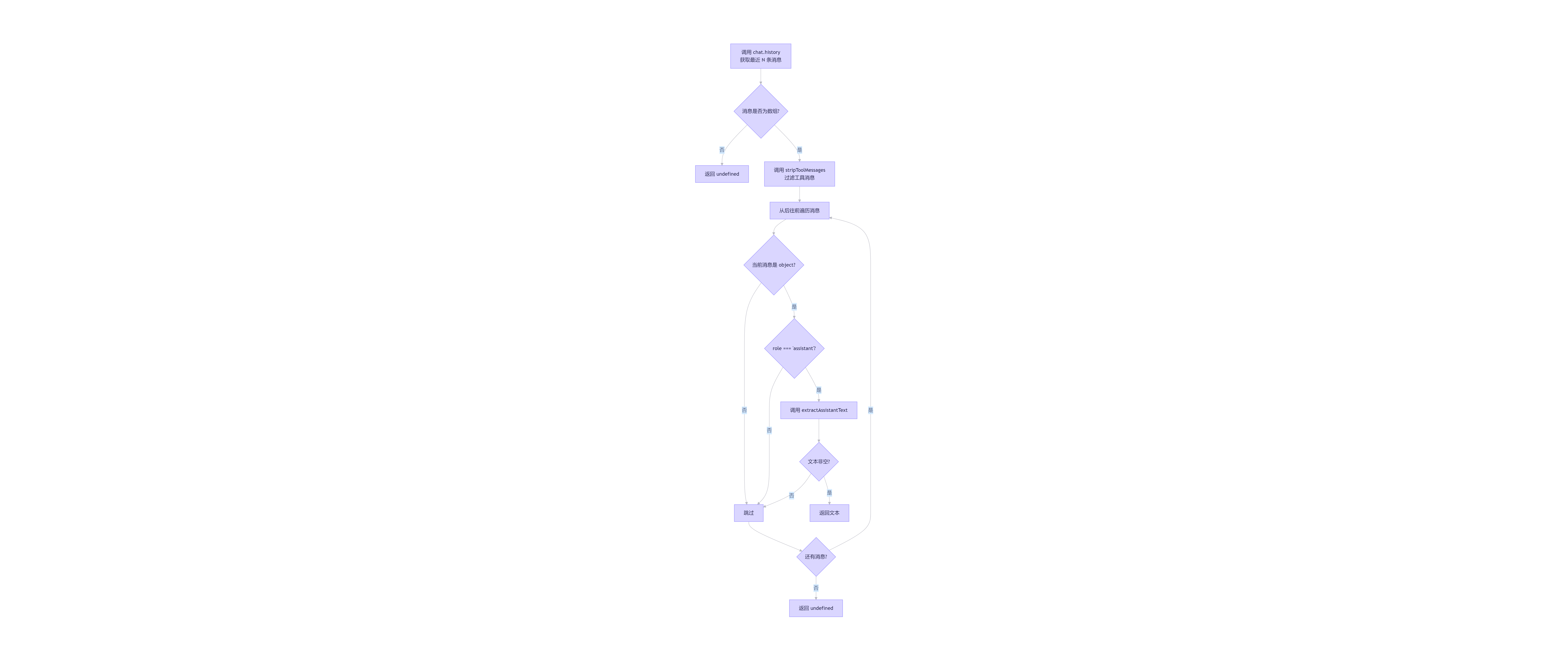 }): Promise<string | undefined>目标:从指定会话的历史消息中,逆序查找最近一条非空的、角色为 assistant 的纯文本回复。