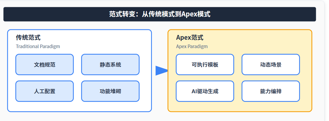 Apex系统正是在这样的背景下应运而生。它不仅仅是一个新的软件系统,更代表着企业软件实施范式的一次根本性突破。Apex的核心理念是:将企业从"流程驱动"转向"场景智能驱动",实现从静态规则到动态适应、从人工配置到AI自动生成、从孤岛系统到生态协同的质变。