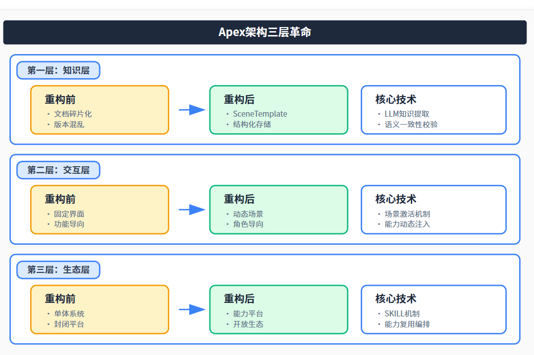 Apex系统的重构不是简单的技术升级,而是架构理念、实现方式、交付模式的全面革新。其核心可以概括为"三层革命":