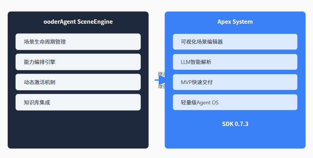 Apex是在ooderAgent SceneEngine基础上开发的场景智能平台。SceneEngine作为ooderAgent生态的核心引擎,提供了场景生命周期管理、能力编排、动态激活等基础能力。Apex继承了SceneEngine的强大基因,并在此基础上进行了深度定制和可视化增强。
