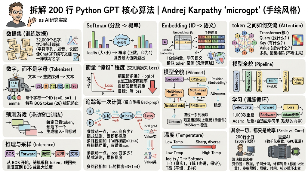 Andrej 自己也在博客里写过一版讲解(https://karpathy.github.io/2026/02/12/microgpt/),但这篇文章更偏可视化,也更照顾初学者。