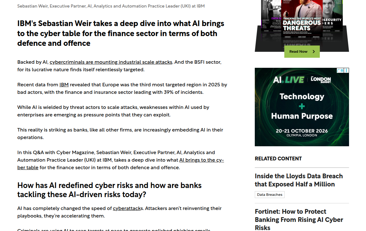 数字经济驱动下,银行业、证券业、保险业加速以 AI 重构核心流程,覆盖智能风控、反欺诈、客户服务、运营自动化、投资决策等场景。AI 在提升效率的同时,也被攻击者用于扩大攻击规模、降低技术门槛、提升隐蔽性,形成攻防不对称格局。IBM 相关威胁报告显示,2025 年欧洲地区成为网络攻击第三大目标区域,金融与保险行业以 39% 的事件占比居首,凸显行业高价值属性带来的持续性威胁。