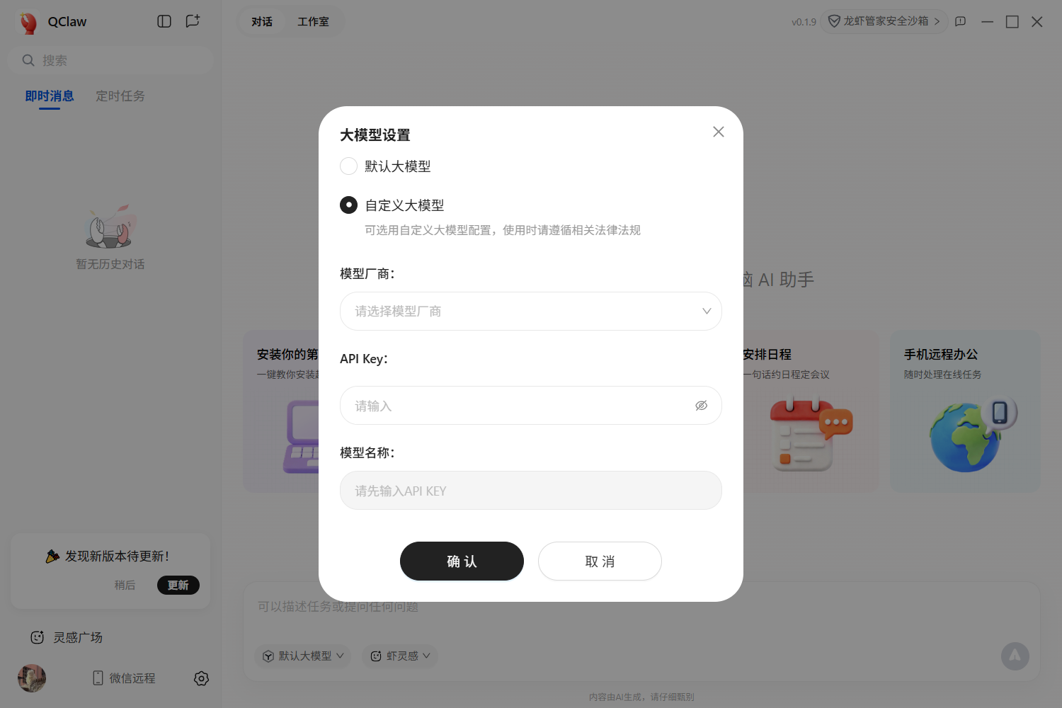 Qclaw 内置了多个国产大模型的接入能力。你也可以在设置中切换为 MiniMax、智谱 GLM、百川等模型。不同模型在不同任务上各有优劣: