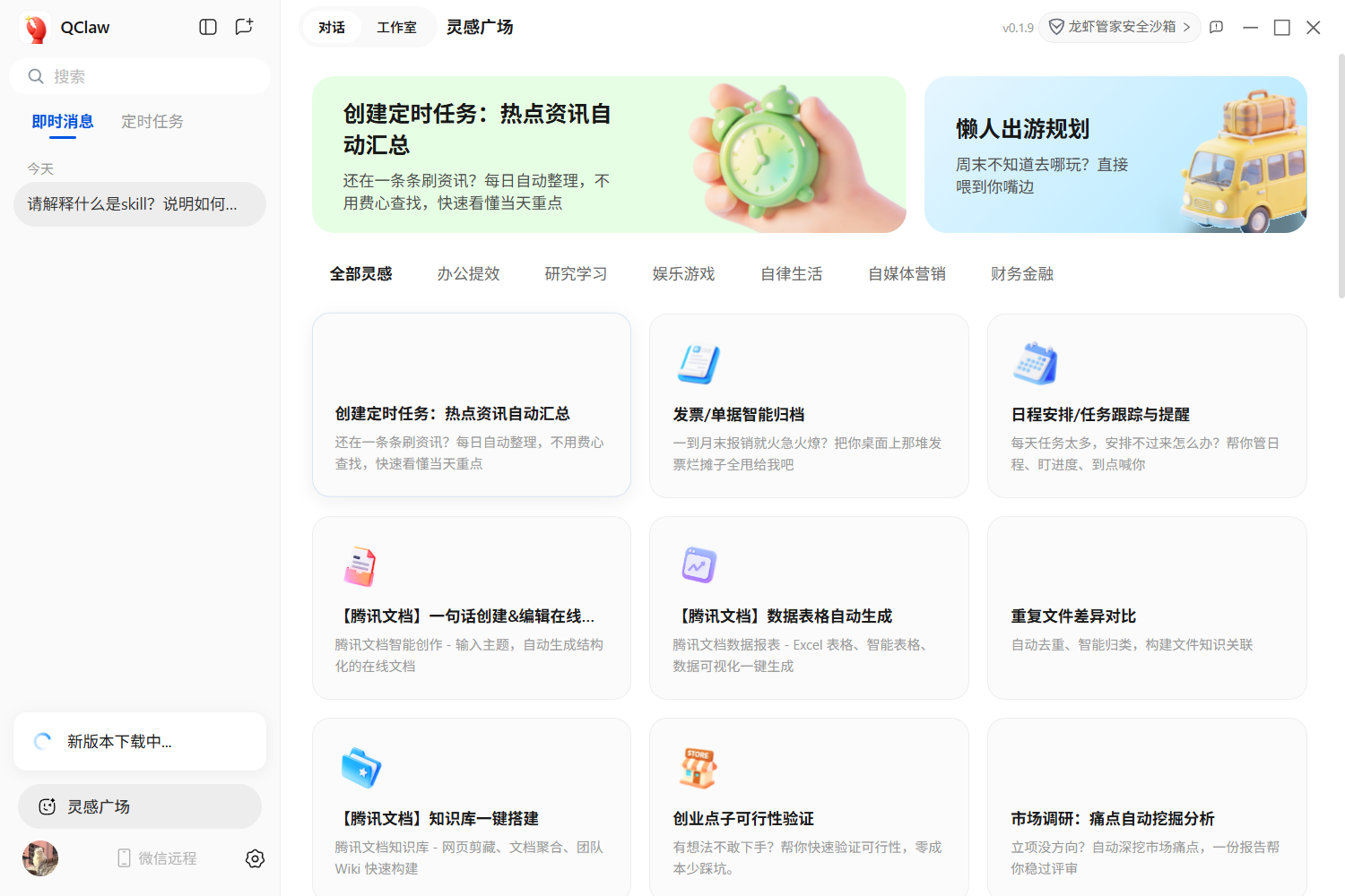 进入 Qclaw 的 ClawHub 页面,你会看到按类别整理好的插件列表:文件处理、浏览器控制、代码执行、数据分析、邮件管理……点击"安装"按钮,等待几秒钟,该 Skill 就会被加载到你的 Qclaw 实例中。
