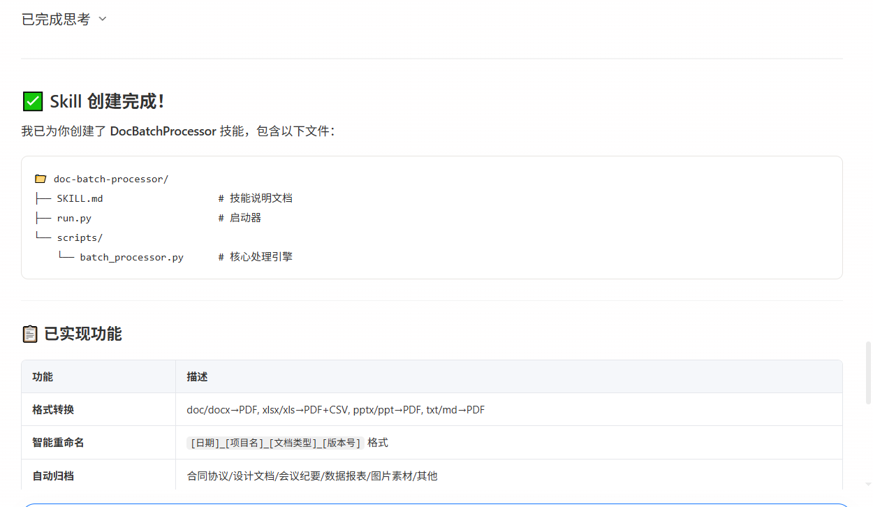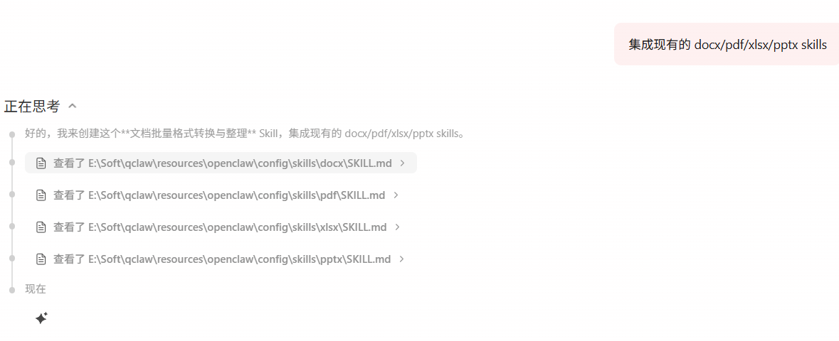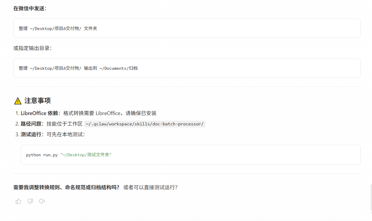 Qclaw 的文档工作流可以一次性处理整个文件夹。你只需要告诉它"把 ~/Desktop/项目A 文件夹里的所有文件转成 PDF,按日期重命名,分类归档",剩下的事情它全包了。
