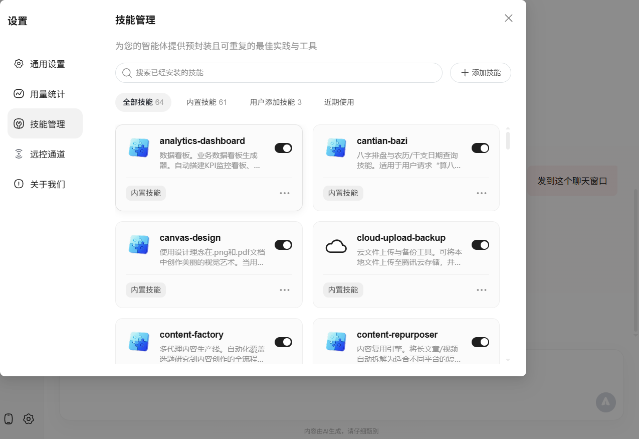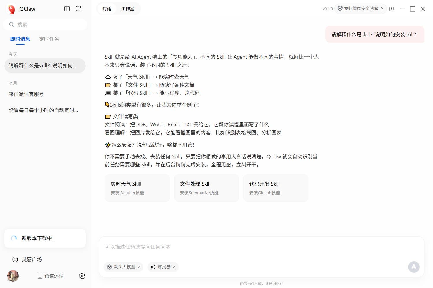 Qclaw 的能力扩展依赖 Skills 插件。你可以把 Skills 理解为"技能包"——每安装一个 Skill,Qclaw 就多会一项本领。