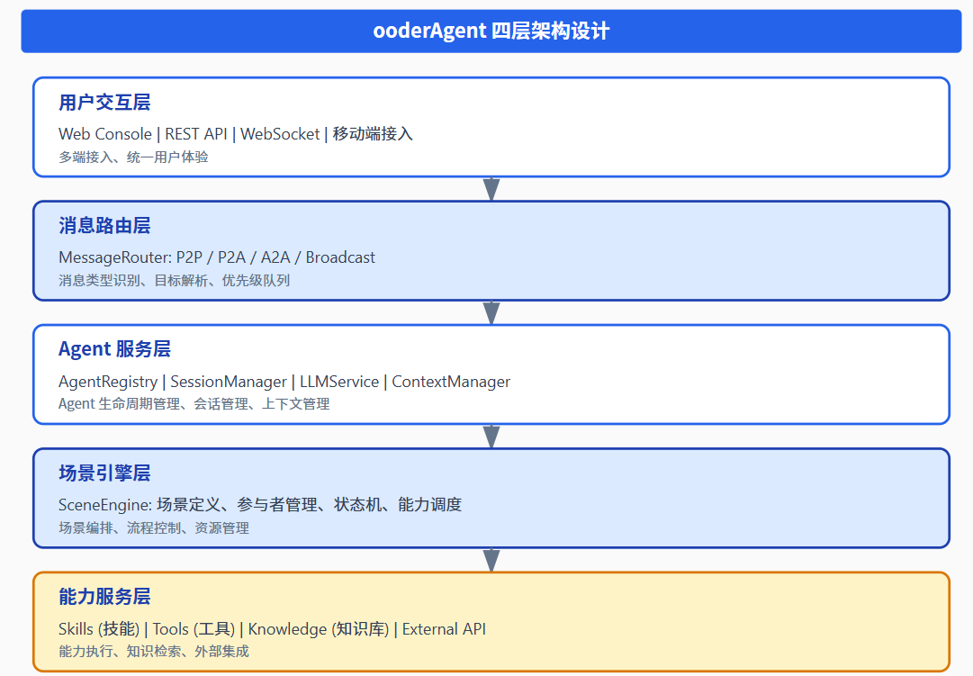 ooderAgent 通过场景驱动的架构设计、清晰的 Agent 分类体系、完善的消息体制、多级上下文管理、灵活的技能系统,构建了一个完整的智能代理生态系统。