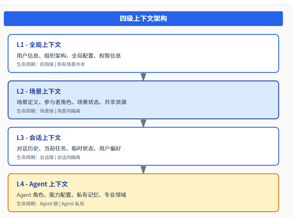 上下文管理是 Agent 智能化的关键。ooderAgent 采用四级上下文架构: