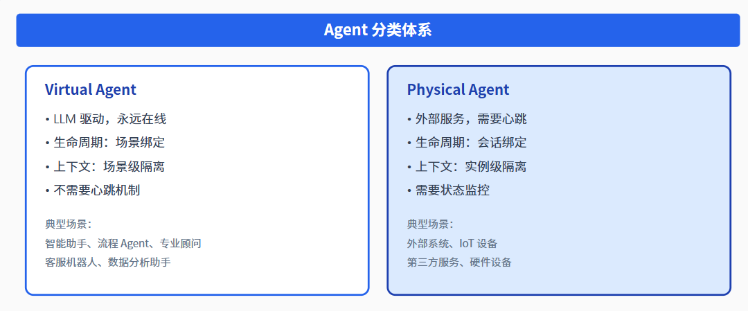 不要试图用一套逻辑处理所有 Agent。Virtual Agent 和 Physical Agent 有本质区别,分类处理可以简化架构,提升系统可维护性。