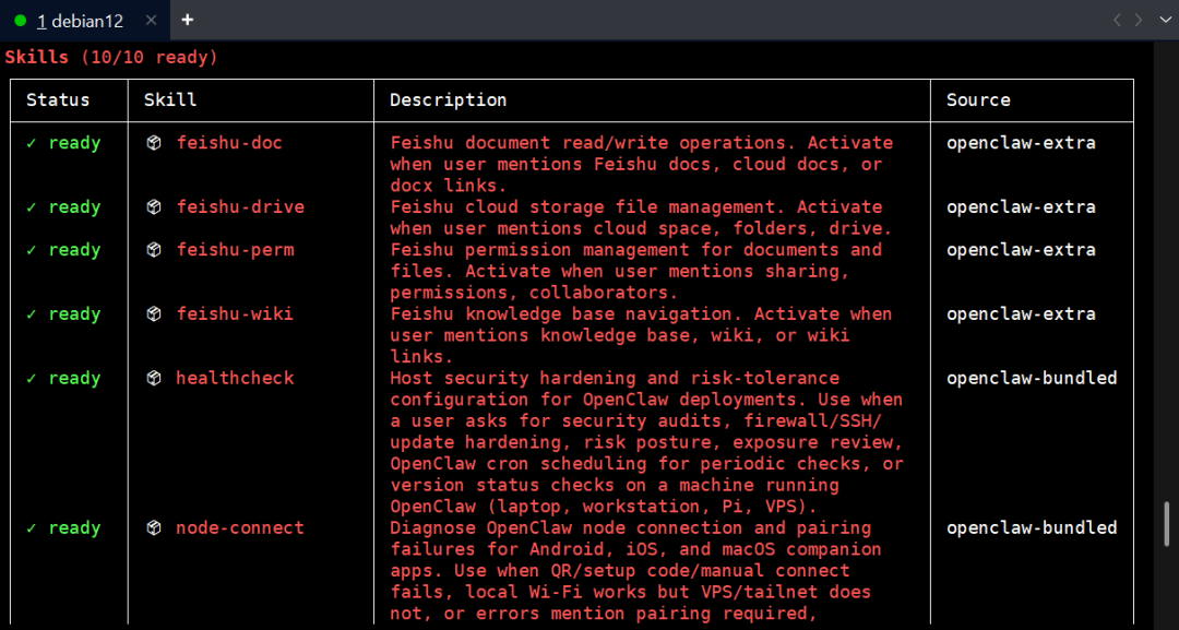 插件状态显示ready时,表示当前skills为可用状态。或者,我们可以通过下面命令,只列出可用的命令。