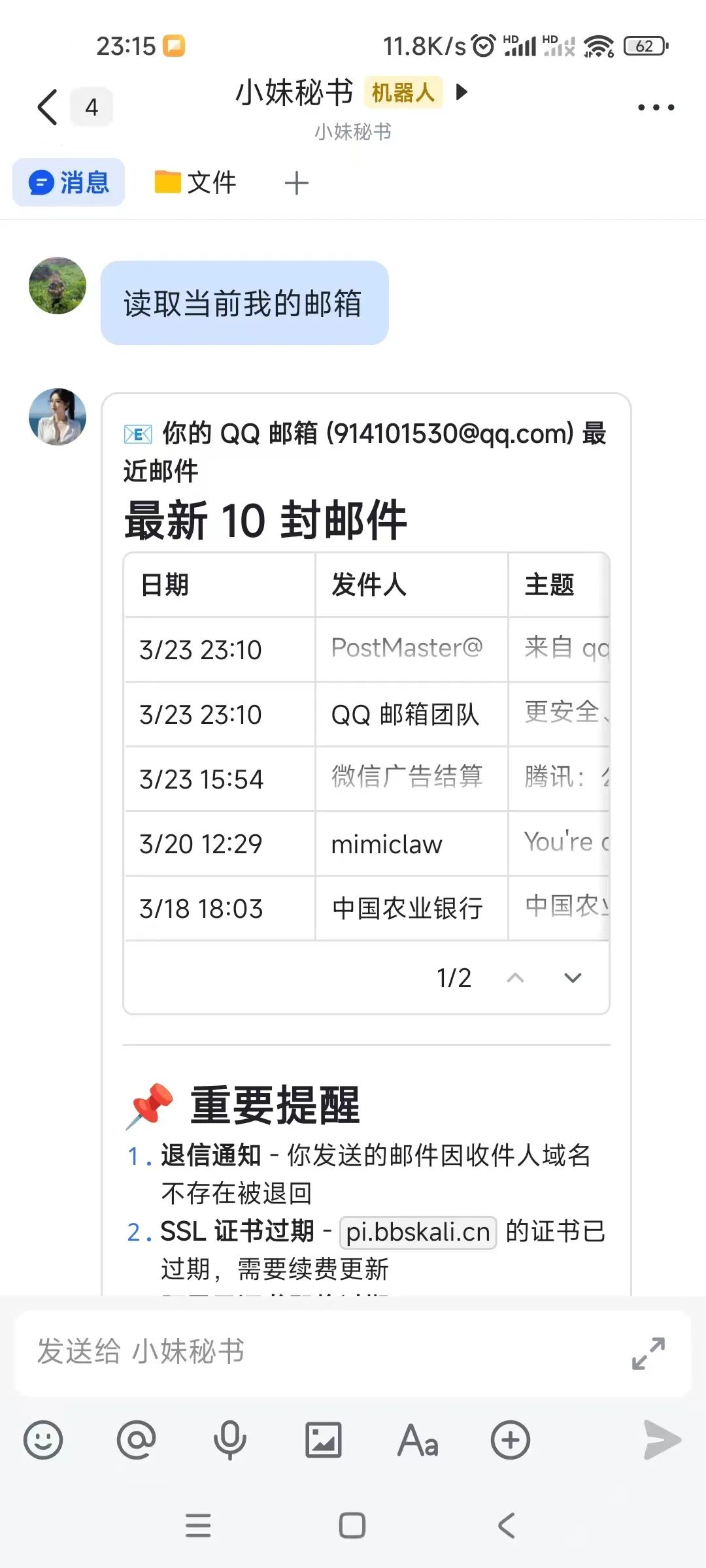 可以看到,已经读到了最近10份邮件,并且将邮件中的重要内容进行了汇总并提示!