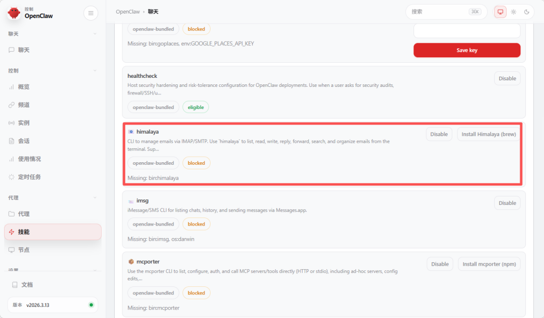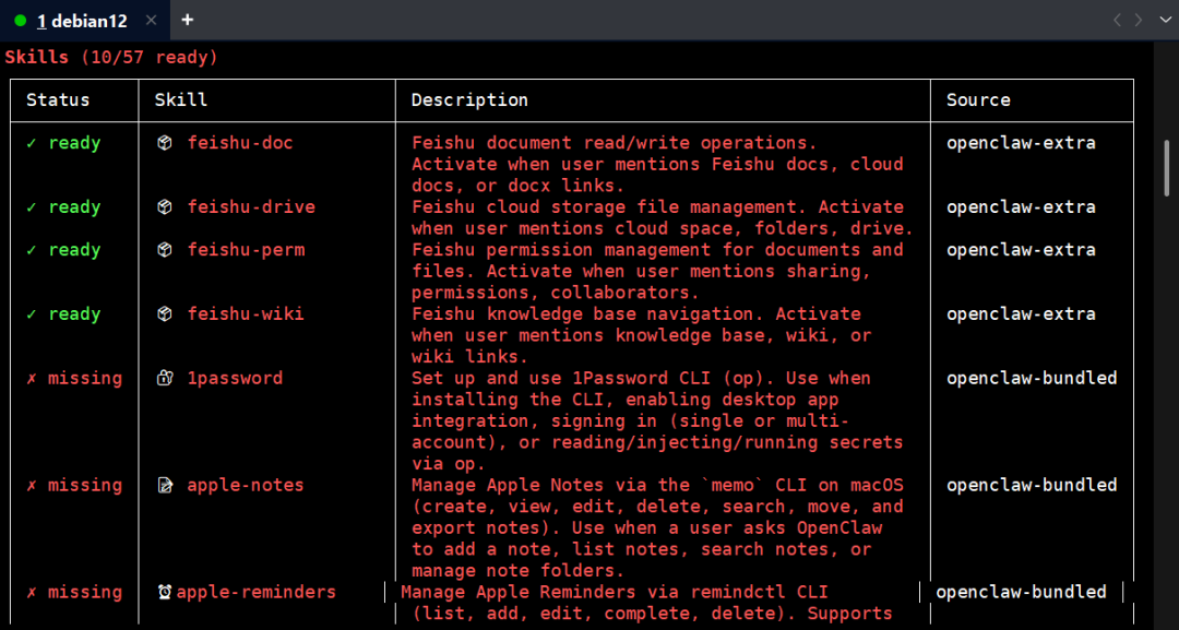 与此同时,我们的OpenClaw也内置了很多技能。多由于缺少相关环境,未能成功激活。